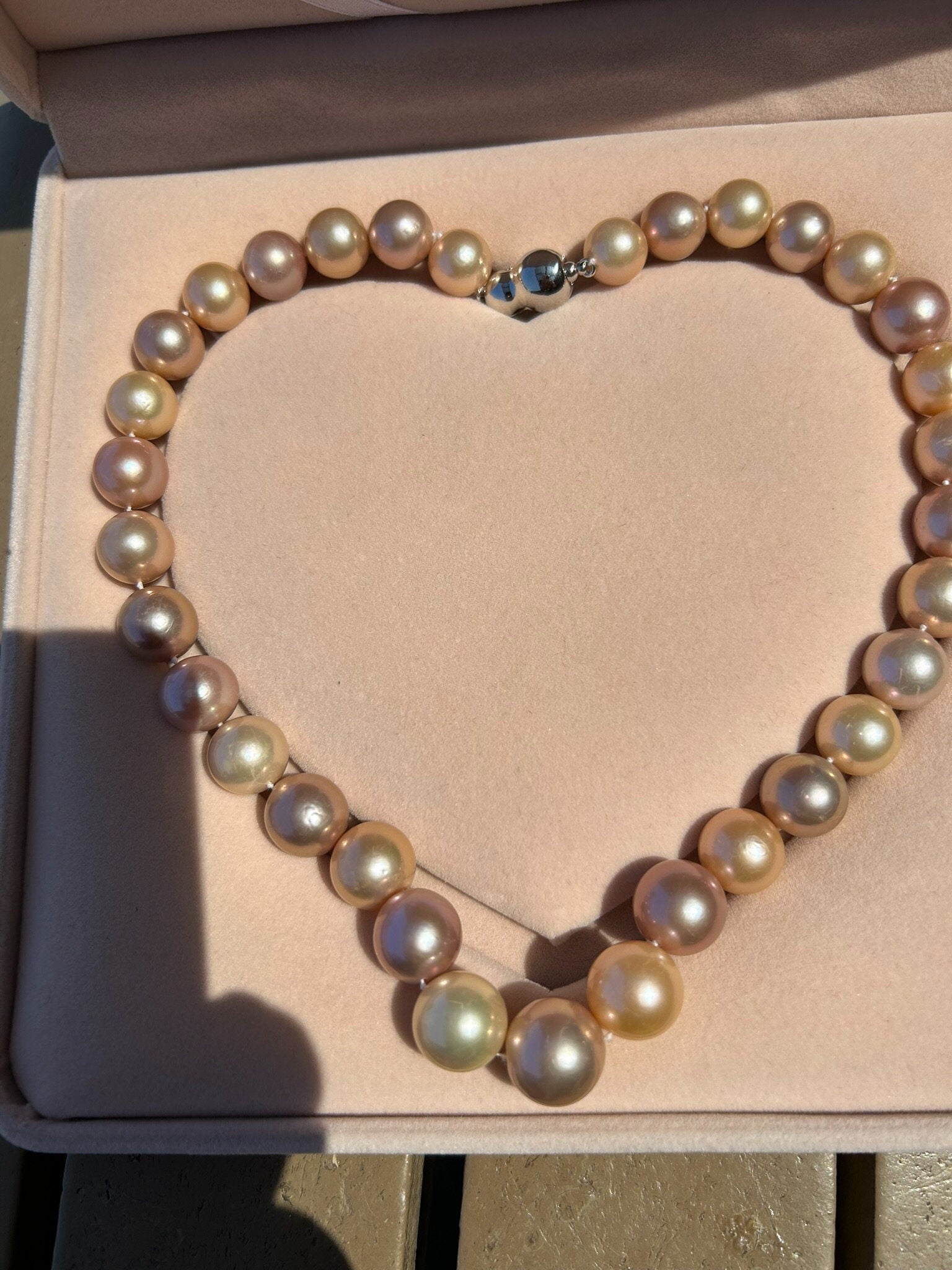 Certified Huge 12mm 18 Inch AAA Multicolor SeaFairy Nature Round Multicolor Reborn keshi Edison Pearl Necklace Main Colour: Multicolor. Stringing: Double Knotted Fine Silk Thread The necklace is professionally hand knotted by double silk threads between each pearl. Material: 100% nature pearl, Genuine pearls,not fake or shell pearls. . This multicolor pearl necklace is composed of 12 mm, natural-color freshwater pearls. They are the highest quality freshwater pearls available, with an inner glow that brings out their warm iridescence. These near-round (AAA)pearls are individually knotted on twin silk and finished. $2,100 appraisal certificate to accompany.
