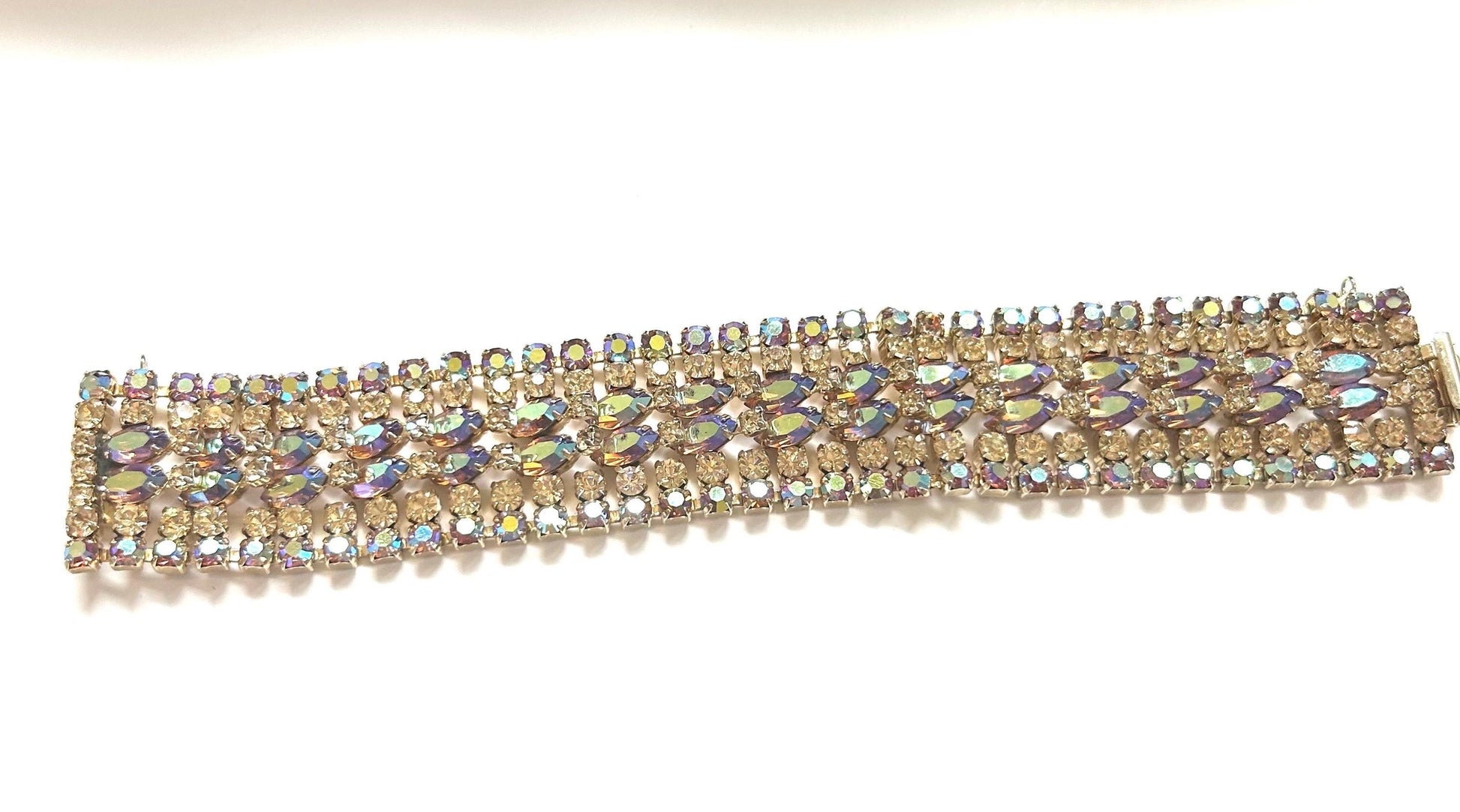 Introducing a beautiful Signed SHERMAN wide bracelet, a stunning piece that combines elegance with vintage charm. Measuring 7 inches in length and approximately 1 inch wide, this bracelet makes a bold statement on the wrist. While it showcases exquisite craftsmanship and design, please note that the safety chain has been removed. Despite this, the bracelet remains in great condition and is perfect for collectors or anyone looking to add a touch of glamour to their jewelry collection. Embrace the timeless appeal of this SHERMAN piece!Collecting Sherman jewelry precisely because its quality endured the test of time. The stones were still vibrant and sparkling decades after the pieces were made, and settings shone as though they had just come out of the box for the first time.