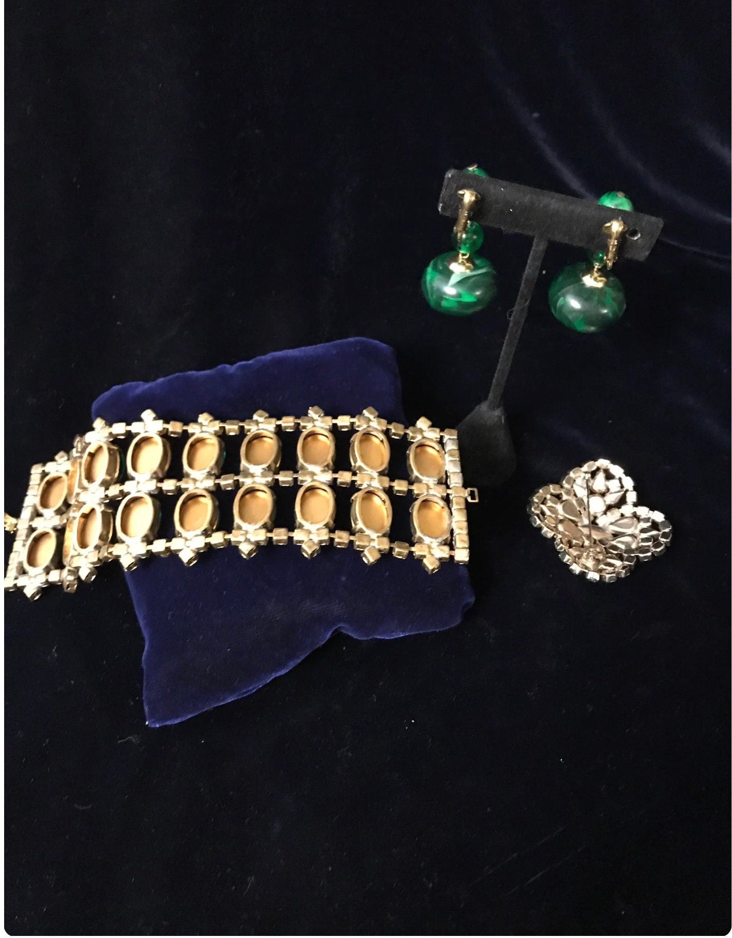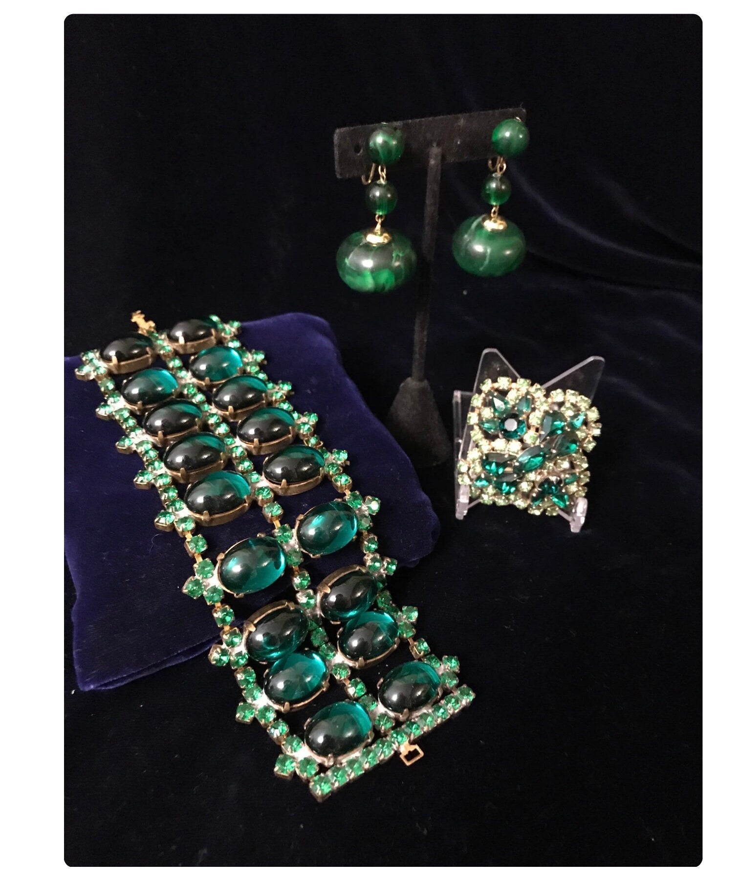 This collection is a perfect choice for special occasions, parties, or as a unique gift for someone who appreciates timeless beauty and style. The combination of vintage Czech brass, emerald green cabochons, and sparkling rhinestones creates a captivating and eye-catching ensemble that will surely make a statement.
