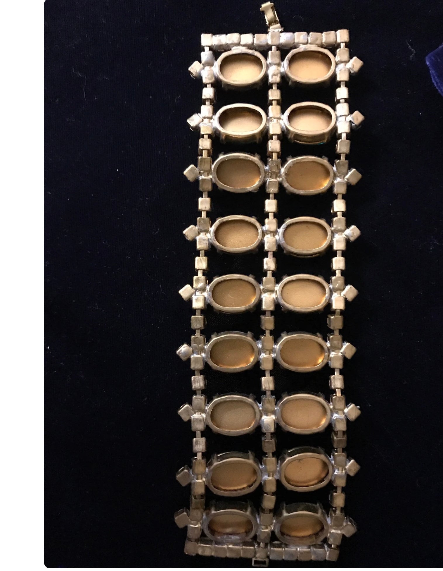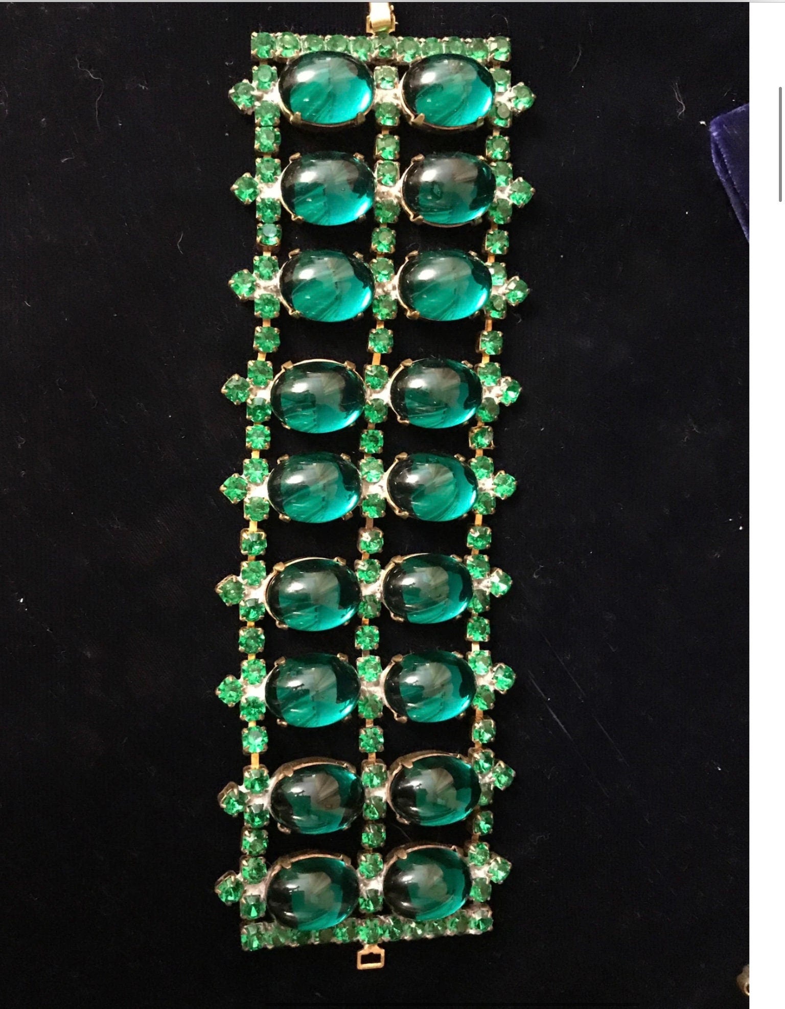 - Vintage Czech Brass Emerald Green Glass Cabochons & Rhinestone Bracelet: This exquisite bracelet showcases a beautiful combination of vintage Czech brass, emerald green glass cabochons, and rhinestones. With a length of 6.5 inches and a width of 2 inches, this bracelet is in excellent condition, radiating a classic and elegant style from that era.