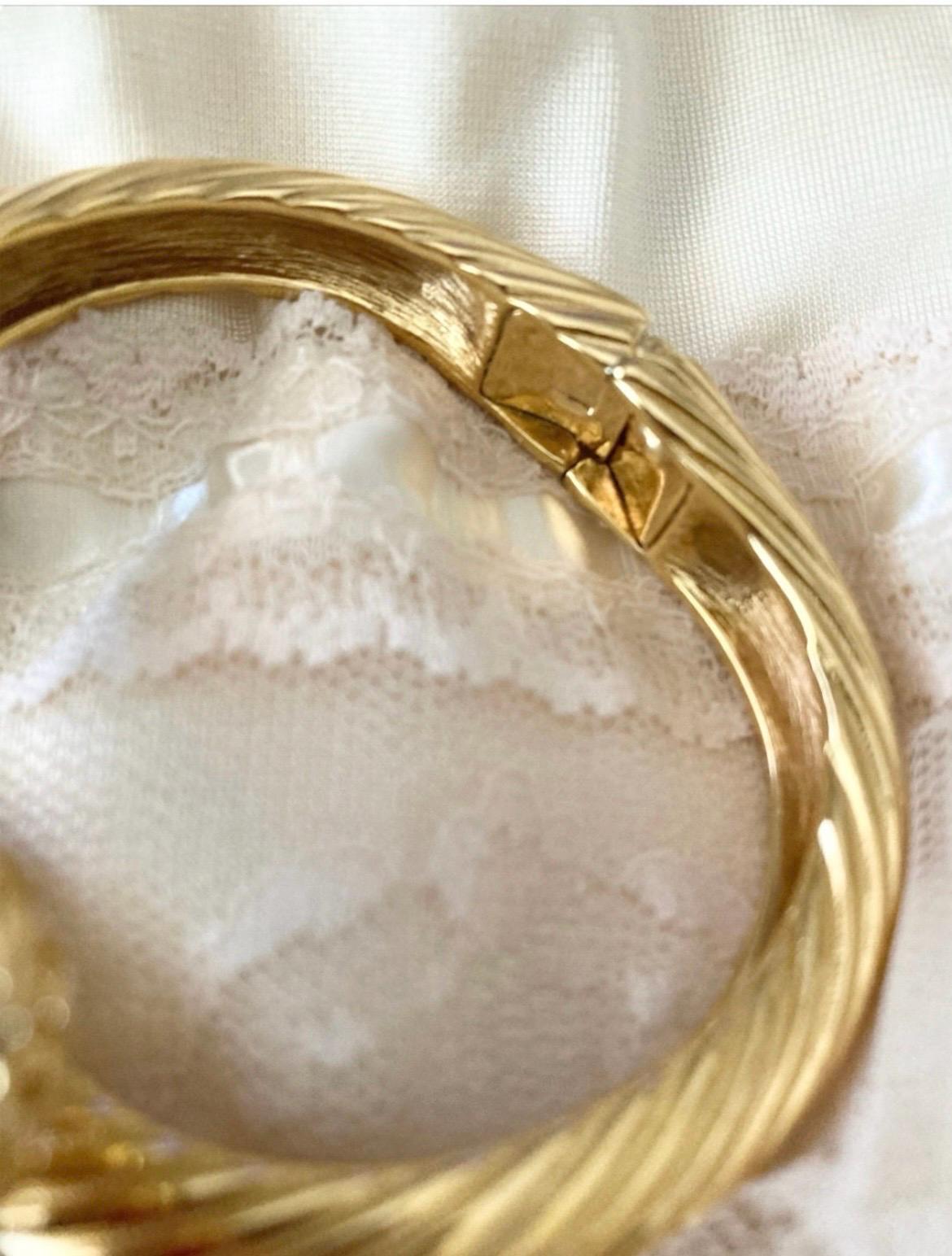 This exquisite bracelet features a gold plated hinged design with three sets of interchangeable tips, allowing for a completely different look. The first set showcases a solid gold plated brutalist style tip, the second set is gold plated with black enamel, and the third set features a center clear rhinestone with tiny clear rhinestones as accents. Each set of tips transforms the bracelet, making it like having three bracelets in one. It is a remarkable addition to any vintage jewelry collection and would also make a thoughtful vintage gift.