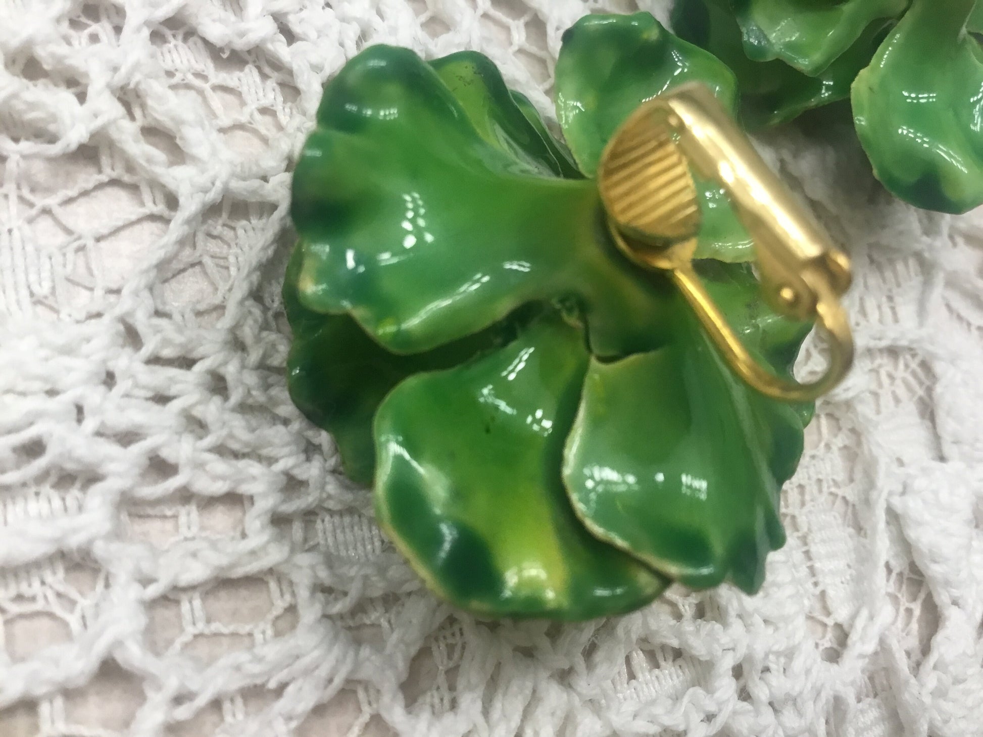 This listing features a stunning large painted enamel flower brooch and earrings set by Vendome. The brooch and earrings have a button center set with green pastes, giving them a unique and eye-catching appeal. These pieces date back to the 1960s and have clip back fittings on the earrings.