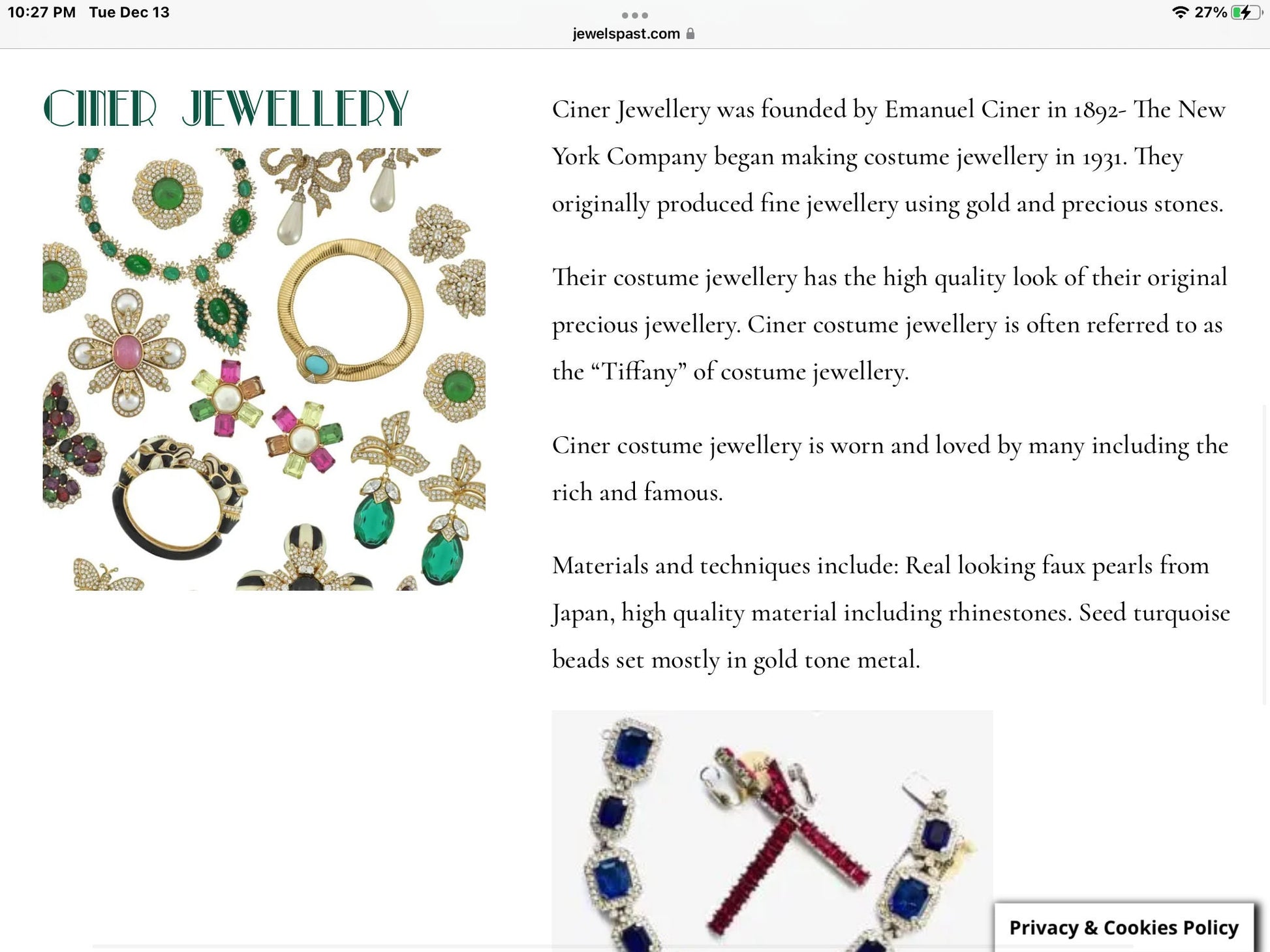 Ciner Jewellery was founded by Emanuel Ciner in 1892- The New York Company began making costume jewellery in 1931. They originally produced fine jewellery using gold and precious stones.