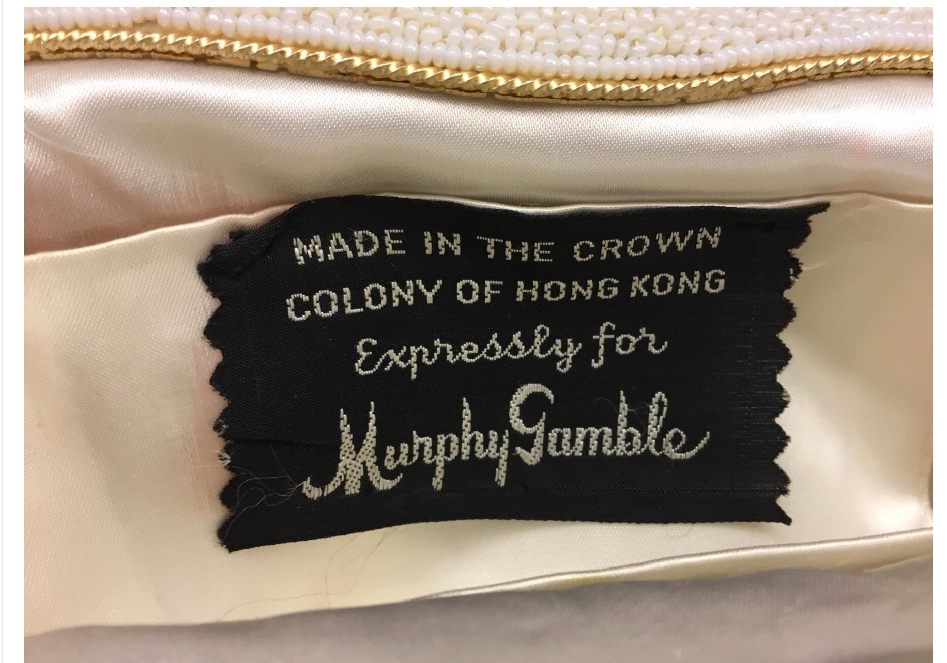 A lovely Vintage Petit Point Embroidered Purse of milky white seed beads accented with detailed flowered embroidery in shades of pinks, blues, golds and greens. The interior is champagne colored satin, with two slip pockets with the same interior satin fabric, along with a tag that reads "HAND BEADED IN THE CROWN COLONY OF HONG HONG". The handbag measures 9 by 6-1/2 inches and has a beaded, fold over snap enclosure.Such a pretty bridal bag equally appropriate for a Romantic, Vintage or Retro style Wedding.
